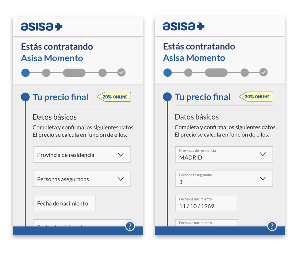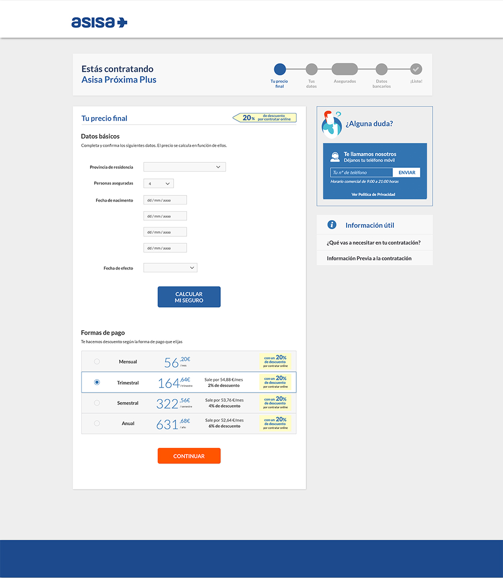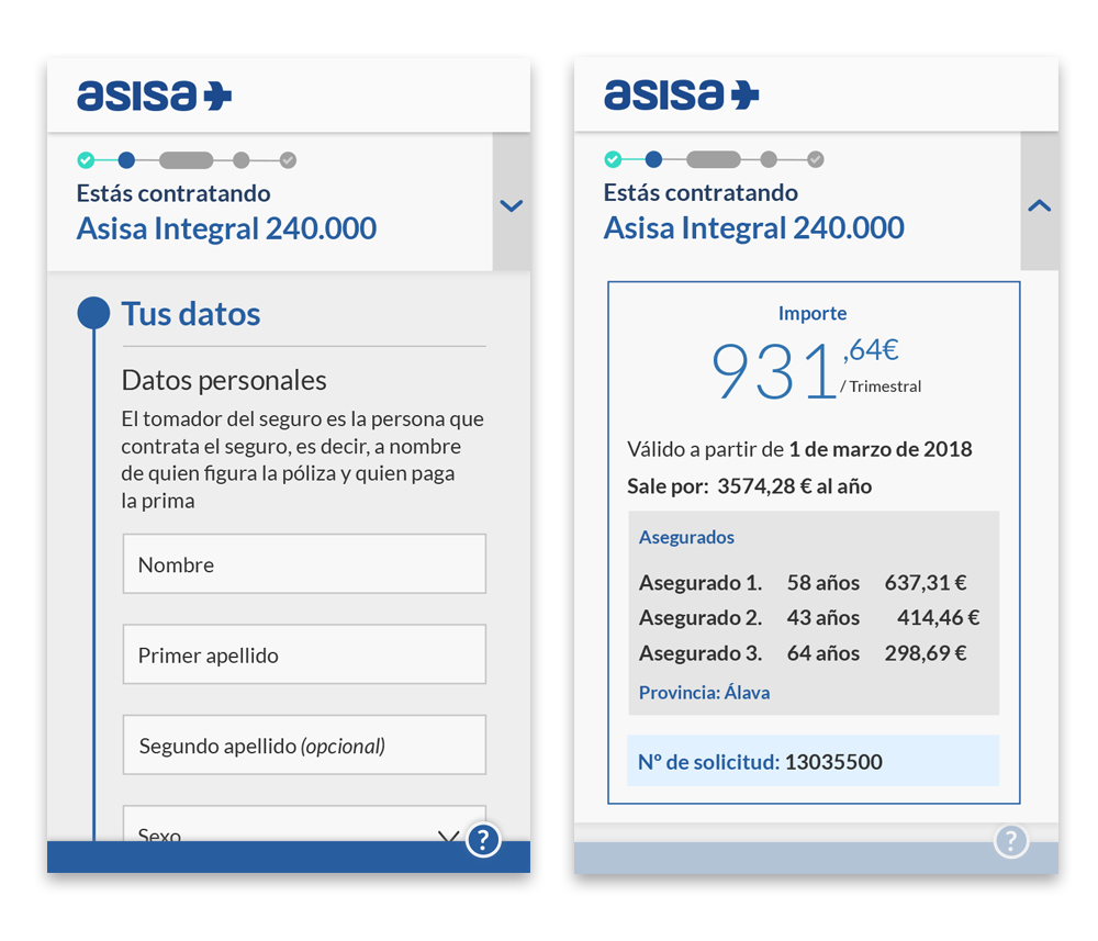 Rediseño integral del procedimiento de contratación de seguros Asisa. La renovación se basa en análisis de usabilidad tras entrevistar a varios usuarios. El procedimiento será idéntico para todos los ramos de Asisa (Salud, Decesos, Dental, Vida, etc) atendiendo a las diferentes casuísticas que pudieran surgir.