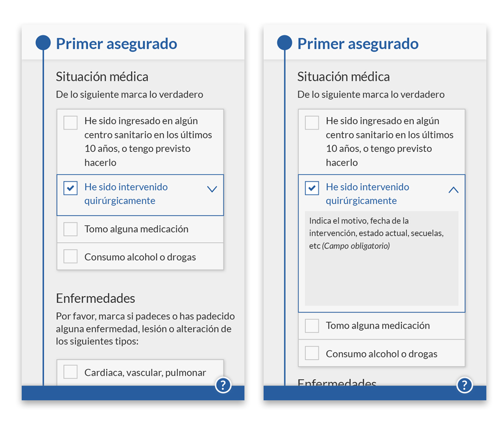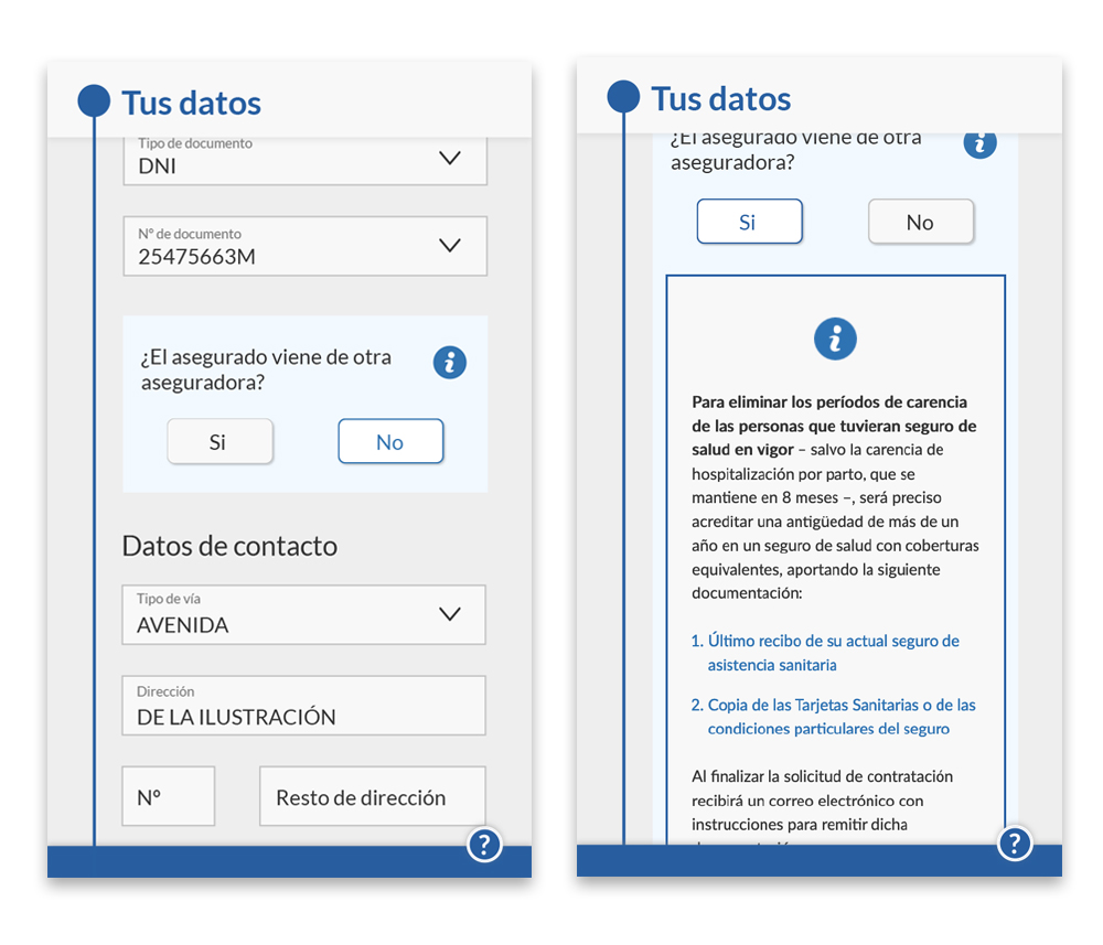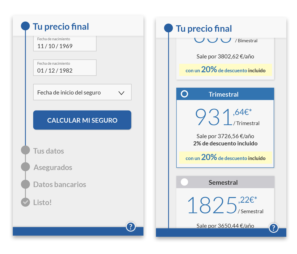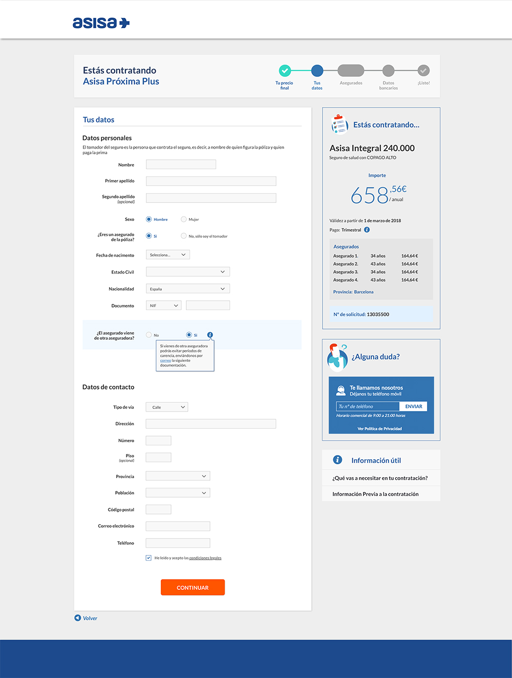 Rediseño integral del procedimiento de contratación de seguros Asisa. La renovación se basa en análisis de usabilidad tras entrevistar a varios usuarios. El procedimiento será idéntico para todos los ramos de Asisa (Salud, Decesos, Dental, Vida, etc) atendiendo a las diferentes casuísticas que pudieran surgir.