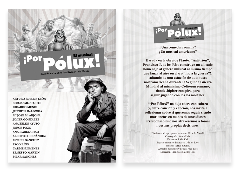 ¡Por Pólux! El Musical, está basada en la obra de Plauto, “Anfitrión”. Francisco J. de los Ríos construye un alocado homenaje al género musical al mismo tiempo que lanza al aire un claro “¡No a la guerra!”, saltando de una estación de autobuses norteamericana durante la Segunda Guerra Mundial al mismísimo Coliseum romano, donde Júpiter conspira para seguir jugando con los mortales.